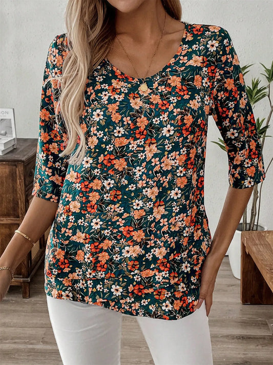 Brown Floral Pattern Short Puff Sleeve Sweater