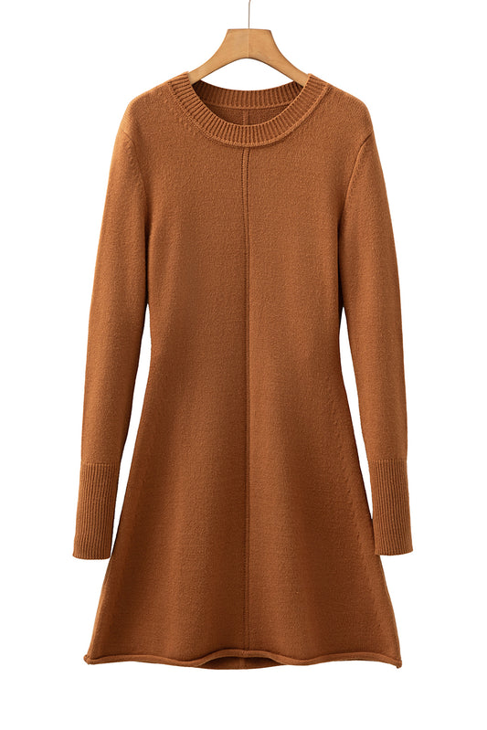 Straw Yellow Ribbed Detail Solid Color Mini Sweater Dress