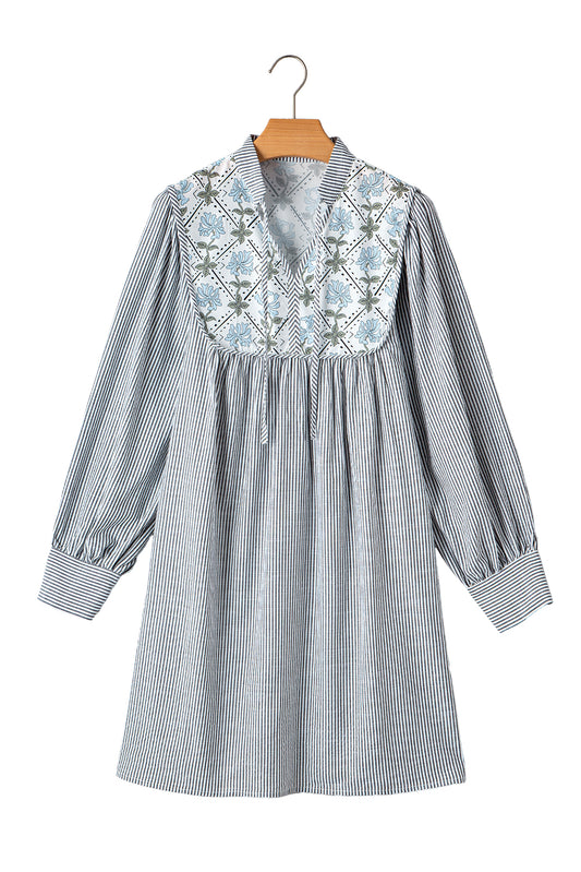 Black Stripe Floral Patchwork Long Sleeve Tie V Neck Mini Dress