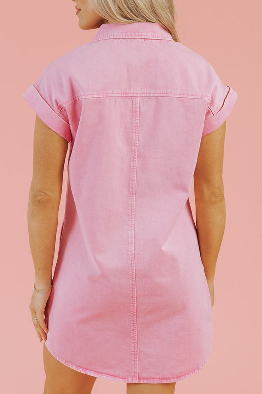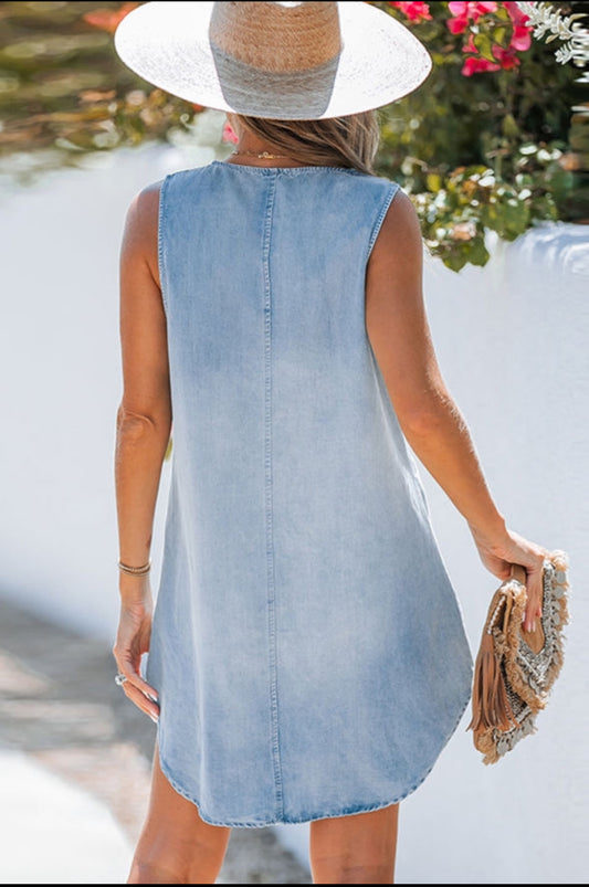 Button Front Chest Pockets Sleeveless Slim Mini Denim Dress