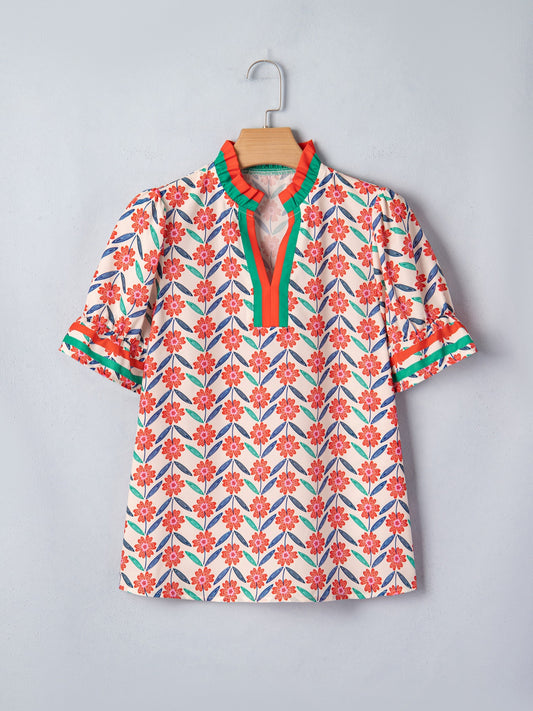 Floral Collared V Neck Short Puff Sleeve Blouse